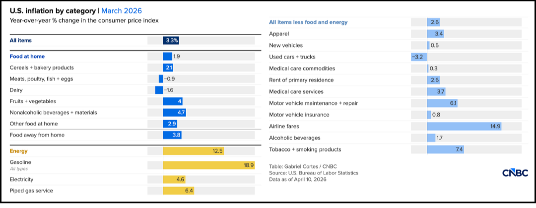 - Inflation Surge: U.S. consumer prices rose 0.9% in March, the largest increase in nearly four years, driven by higher oil prices from the Iran conflict and tariff effects. Excluding volatile food and energy, core CPI increased 0.2%, signaling sustained inflation pressures and diminishing chances for rate cuts this year.